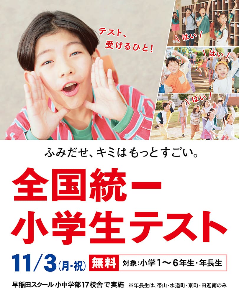 試験会場 | 早稲田スクール 小中学部 17校舎 ※年長生は、帯山校・水道町校・京町校・田迎南校のみ 詳しくはコチラ |